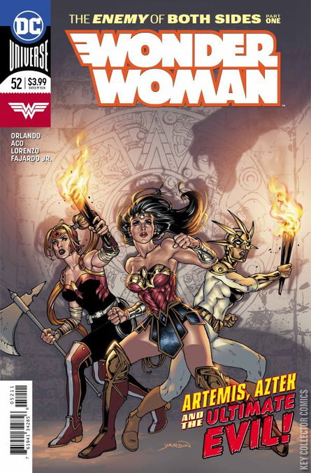 THE ENEMY OF BOTH SIDES, PART ONE At the behest of Aztek, Diana and Artemis join her for a trip to Mexico, but there’s no sightseeing on the agenda. Instead, they must rescue a long-lost Amazon who’s being held captive by rogue deity Tezcatlipoca, who’s trying to break into our world. Can our three heroes save the missing Amazon, stop a raging god and not kill one another in the process?