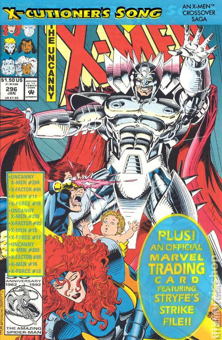 "Crescendo (X-Cutioner's Song Pt. 9)" Continued from X-Force #17. Beast completes surgery on Professor X to remove Stryfe's bullet. Moira tells Beast she broke Stryfe's code in the T-O virus but it only says "You are smart but I am smarter" over and over. Apocalypse, detained in the X-Mansion, suggests that he can save Xavier and Archangel vouches for him.Meanwhile, Stryfe's torture of Cyclops and Jean Grey continues. He presents them with an infant and tells them they if they destroy the child, they will destroy him as well. To Stryfe's amazement, they choose to rescue the child.Cable uses the Professor to find Stryfe on Earth and comes to the conclusion that he's not on the planet. Story continues in X-Factor #86. Having escaped their cell, Cyclops and Jean Grey find themselves cornered by a select few of Stryfe's...
