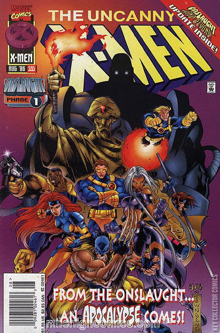 "Apocalypse Lives" Apocalypse awakens and consults the Watcher. And Onslaught gathers his minions! This issue confirms Onslaught to be its own being. Scott explains to the Avengers, "Onslaught is pure. . . living psionic energy,," and Jean expands, "Somehow there are elements of both Xavier's and Magneto's Personae in there -- as if the fusing has created a *third* being."